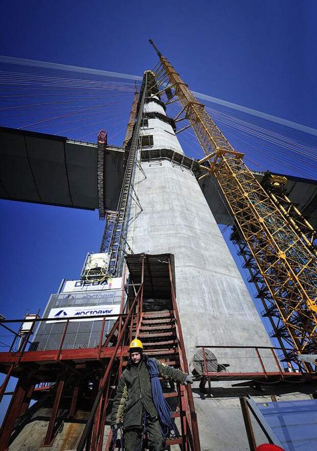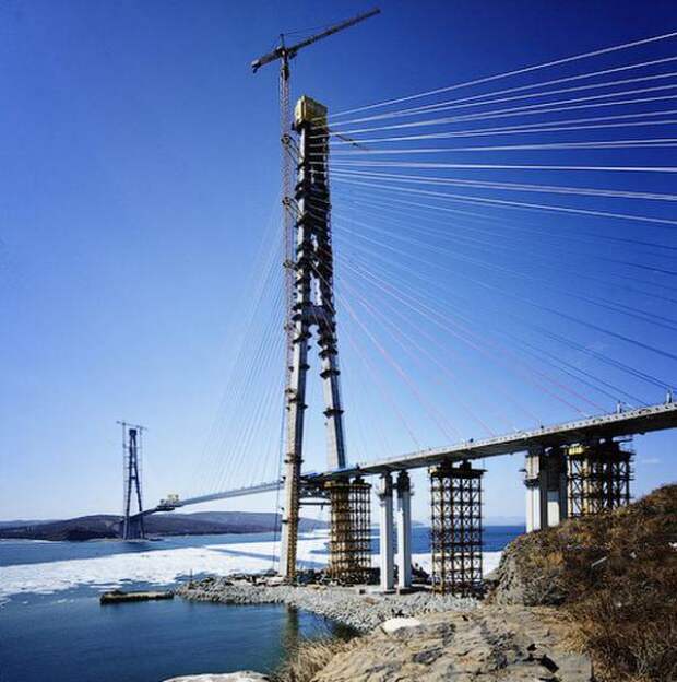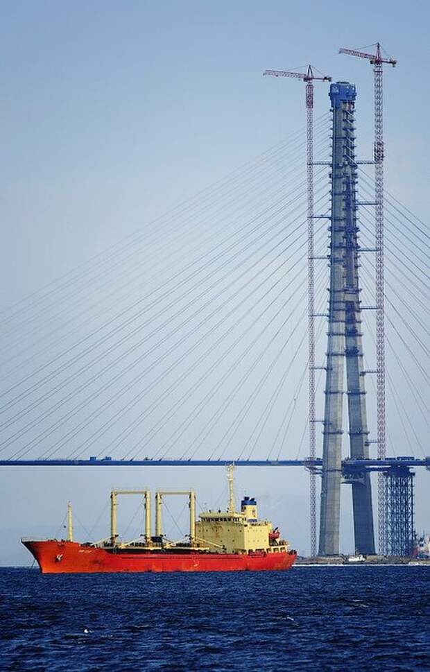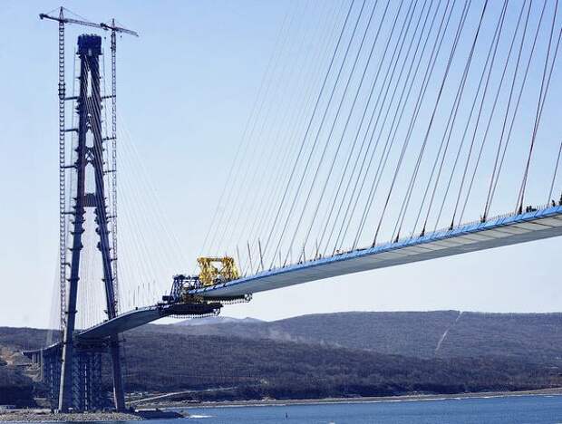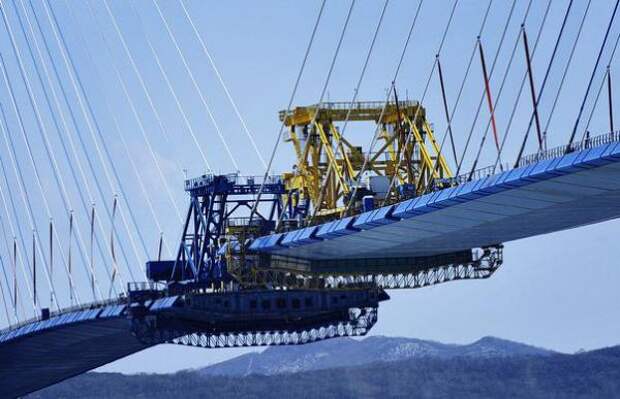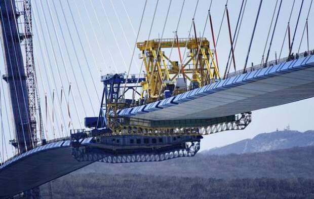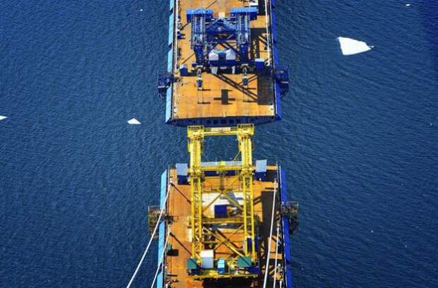 Рабочим осталось поднять три панели: со стороны материка, со стороны острова Русский и последнюю, замковую — по 12 метров каждая.