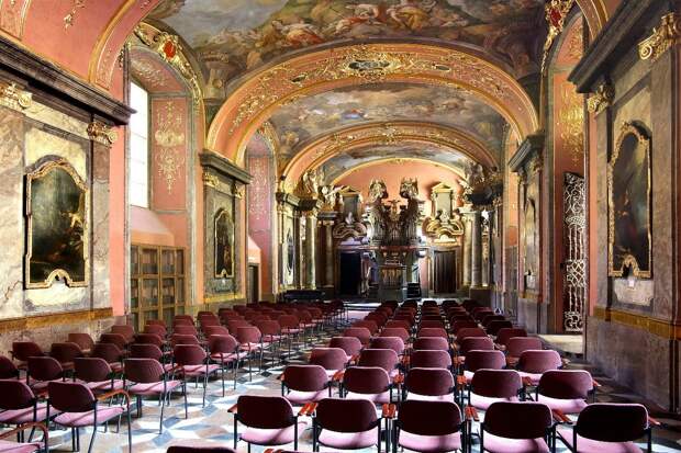 Если взглянуть поверх окон, то в треугольниках можно увидеть изображения известных иезуитов. Центр зала украшен огромными глобусами.