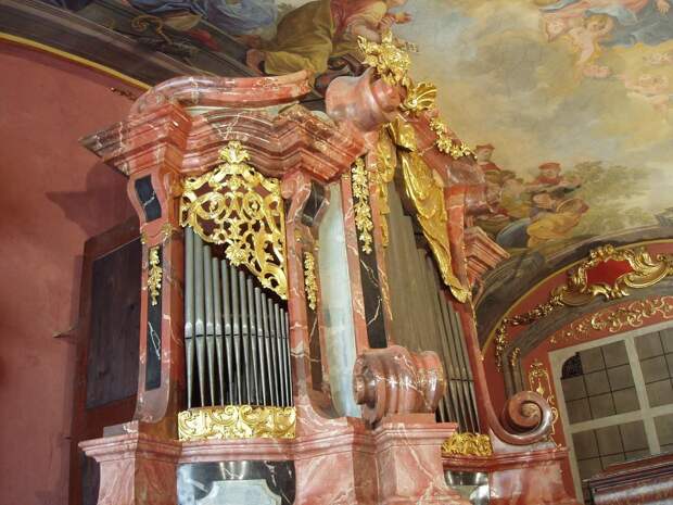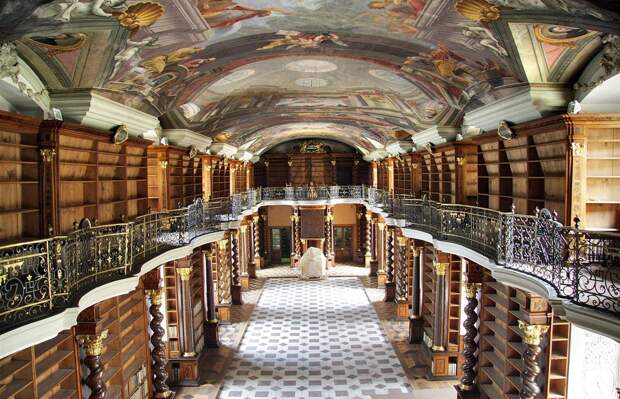 Библиотека в барочном стиле, созданная здесь в 1722 году, не подвергалась изменениям, и отражает устройство библиотек того времени. Она считается одним из самых красиво оформленных помещений всего комплекса. Зал, где хранятся сотни тысяч ценнейших книг, украшен фресками мастера Джозефа Дибела, которые изображают Искусство и Науку. Картины, размещенные на куполе библиотеки, представляют Храм Мудрости.