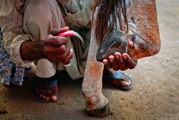 15. Карачи. Ожидая открытия рыночных лавок, хозяин решил почистить копыта у своего осла. (Reuters/Akhtar Soomro)