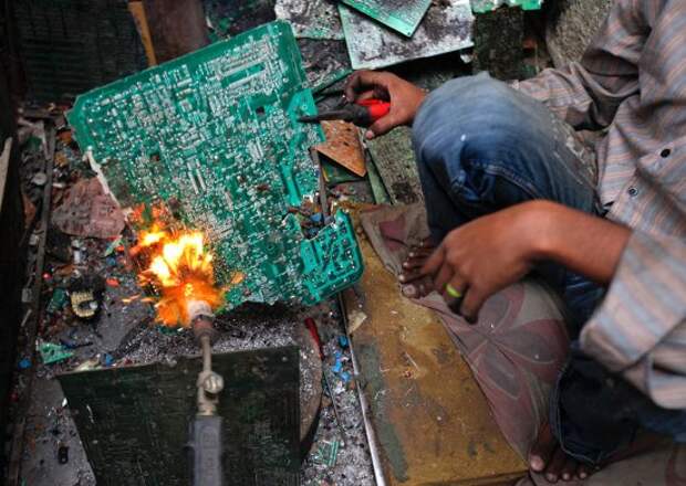 2. Вот таким нехитрым способом из старых компьютерных плат выплавляют драгоценные металлы. (Reuters/Athar Hussain)