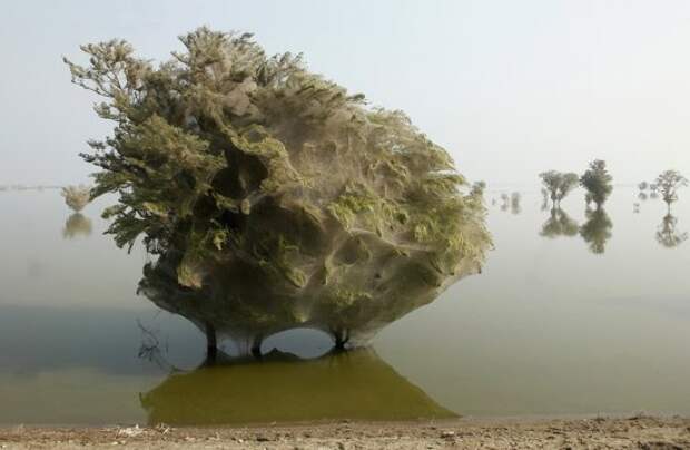 8. Спасаясь от наводнения, пауки взобрались на деревья и превратили их в свои коконы, похожие на гигантские палочки сладкой ваты из паутины. (Reuters/Department for International Development/Russell Watkins)